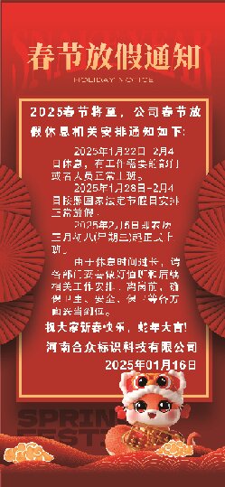 新春來臨之際,河南合眾標識科技有限公司 祝您:新年快樂、闔家歡樂!愿您在新的一年里事業有成、財源廣進、身體健康、萬事如意!讓我們一起迎接美好的明天吧!