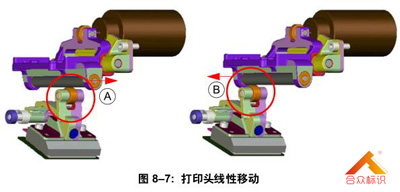 打印系統包含 24V 的電磁圈 (A),傳動裝置 (B)、打印模塊盒 (C),打印模塊盒中