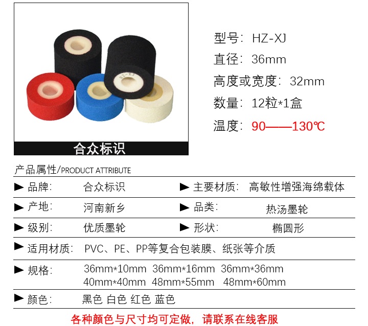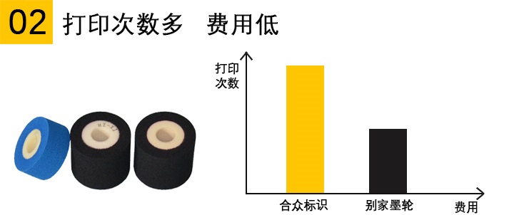 熱燙墨輪配套于墨輪打碼機、380識標機、封口機等包裝打碼機械,應用于食品、醫藥、飲品等行業。在各種軟包裝、紙張、塑料袋等材料表面打印各種文字、數字標識,具有使用方便、字跡清晰、不易脫落、快干等特點。墨輪是由海綿體和固體油墨組成,配套于墨輪機使用,用于塑料、薄膜、紙質等材料表面印制生產日期,批號等標識。固體墨輪是比之油墨更為先進的打印材料,采用固體墨輪,字跡清晰、 瞬印瞬干,附著力強,顏色多樣、更換方便,成本低,且無油墨污染之憂。具有使用方便,字跡清晰、不易脫落、快干、無溶劑污染、打印次數多等優點,與墨輪機配合可實現快速打印。